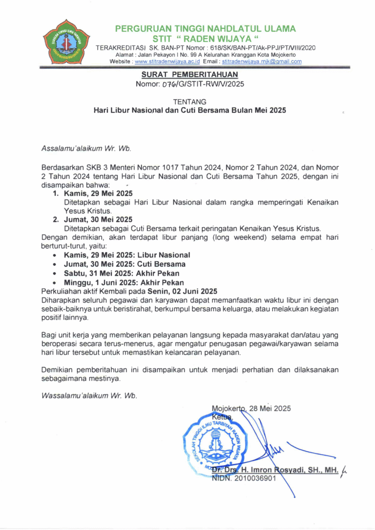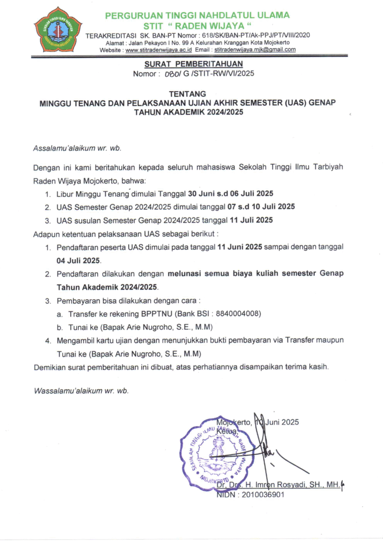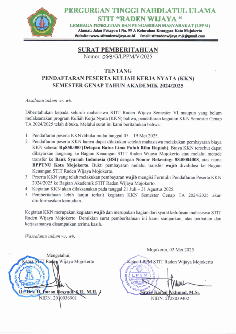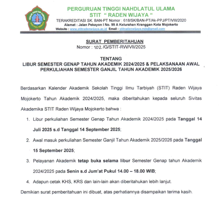 STIT Raden Wijaya Mojokerto membuka pendaftaran Program Kartu Indonesia Pintar Kuliah (KIP-K) Tahun 2025 bagi calon mahasiswa baru. Pendaftaran dilaksanakan pada tanggal 15–22 September 2025. Calon peserta wajib memenuhi seluruh persyaratan dan mengikuti alur seleksi yang telah ditetapkan. Surat pemberitahuan…