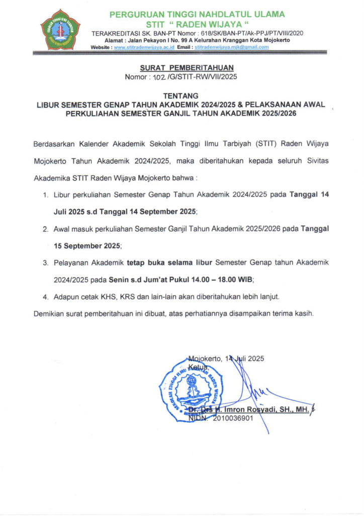 Berdasarkan Kalender Akademik Sekolah Tinggi llmu Tarbiyah (STIT) Raden Wijaya Mojokerto Tahun Akademik 2024/2025, maka diberitahukan kepada seluruh Sivitas Akademika STIT Raden Wijaya Mojokerto bahwa :