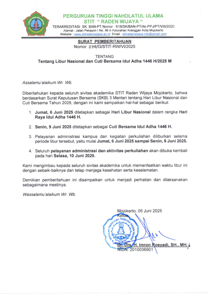 Diberitahukan kepada seluruh sivitas akademika STIT Raden Wijaya Mojokerto, bahwa berdasarkan Surat Keputusan Bersama (SKB) 3 Menteri tentang Hari Libur Nasional dan Cuti Bersama Tahun 2025, dengan ini kami sampaikan hal-hal sebagai berikut: