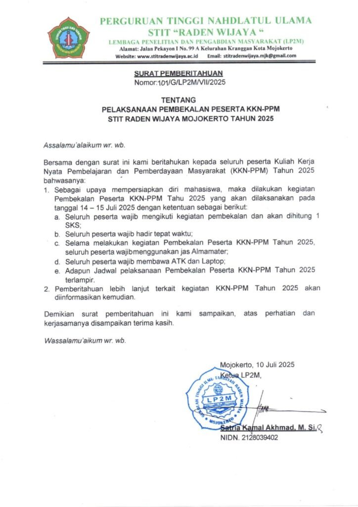 Bersama dengan surat ini kami beritahukan kepada seluruh peserta Kuliah Kerja Nyata Pembelajaran dan Pemberdayaan Masyarakat (KKN-PPM) Tahun 2025 bahwasanya: