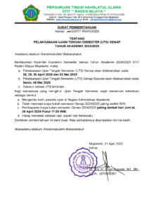 Berdasarkan Kalender Akademik Semester Genap Tahun Akademik 2024/2025 STIT Raden Wijaya Mojokerto, maka:a. Pelaksanaan Ujian Tengah Semester (UTS) Genap akan dilaksanakan pada tanggal 28, 29,